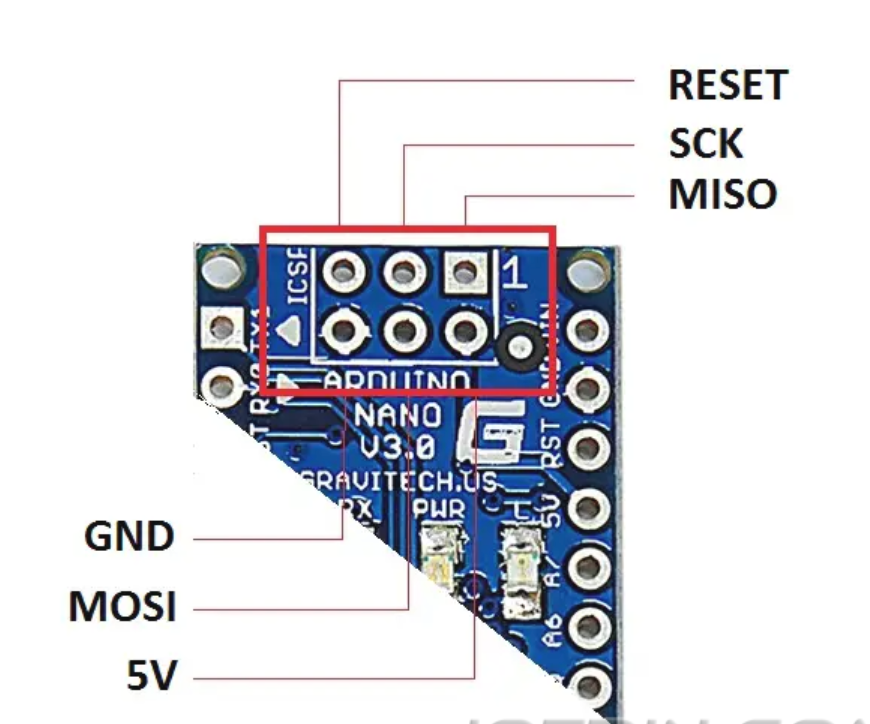 SCP(Serial Peripheral Interface) 를 이용하여 ICSP 를 할 경우, 핀맵(Pinout)을 확인하는 경우가 허다하다. 그런데 아두이노 나노의 경우, 작은 함정이 있다. 검색을 해 보면 아래와 같이 대부분 나와 있다. 거의 모든 자료가 그렇다.