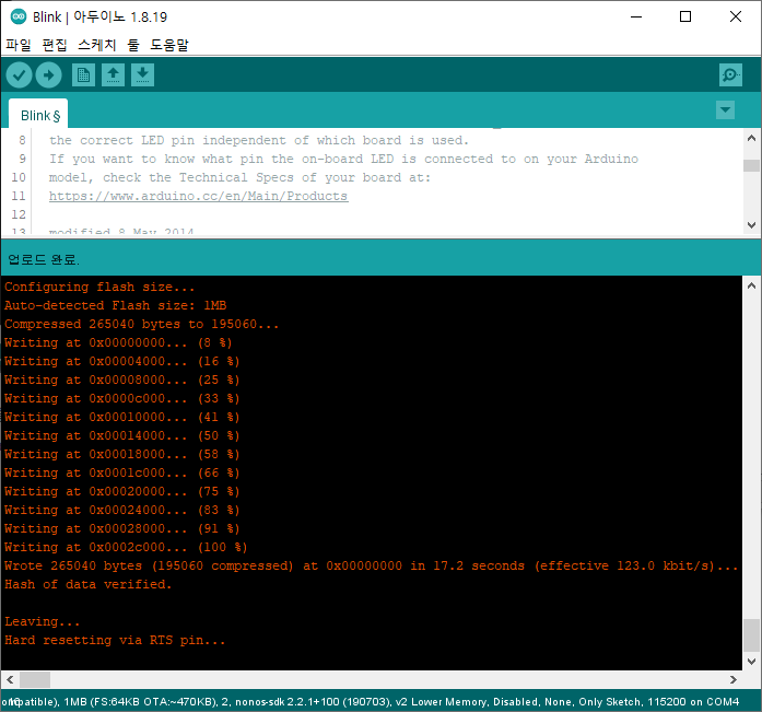 당연하게도 업로드 하는 시점에 ESP8266 의 RESET 을 GND 와 잠시 연결했다 떼어주어야 한다. 앞서 결선도라면 RESET 버튼을 한번 눌러주면 된다. 그러고나면 문제없이 스케치가 올라간다.