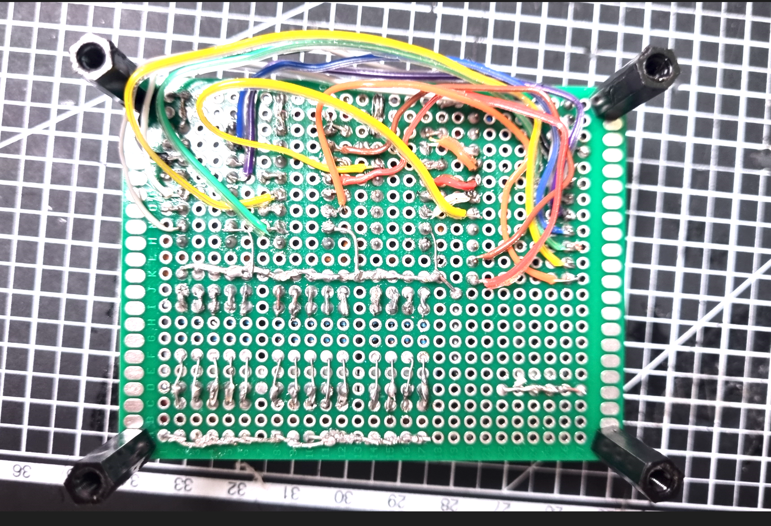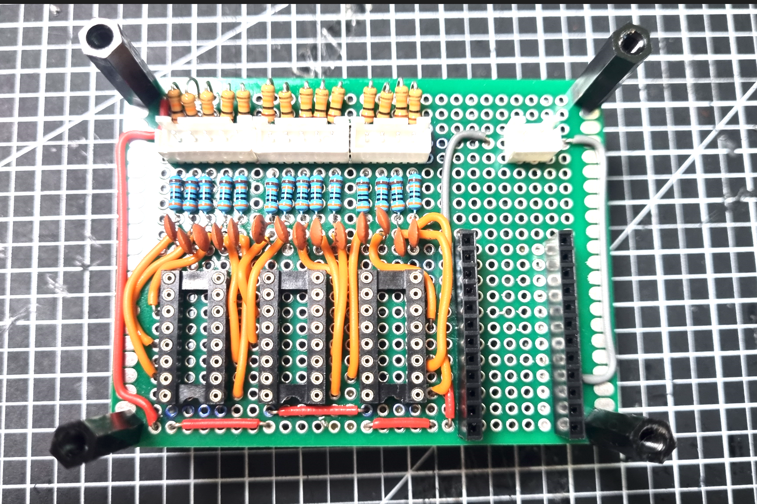 후...여기까지가 74HC14 의 Output 핀과 아두이노 기판의 연결을 제외한 모든 연결을 마친 상태이다. 이제 가장 큰 놈이 남았다. 74HC14 에서 총 14개의 선을 아두이노 기판에 연결해야 한다. 문제는 자리가 너무 협소하다. 앞판에 이 모든것을 우겨 넣는것은 거의 불가능하다고 판단되어, 해당 연결은 뒷판에서 하기로 했다.